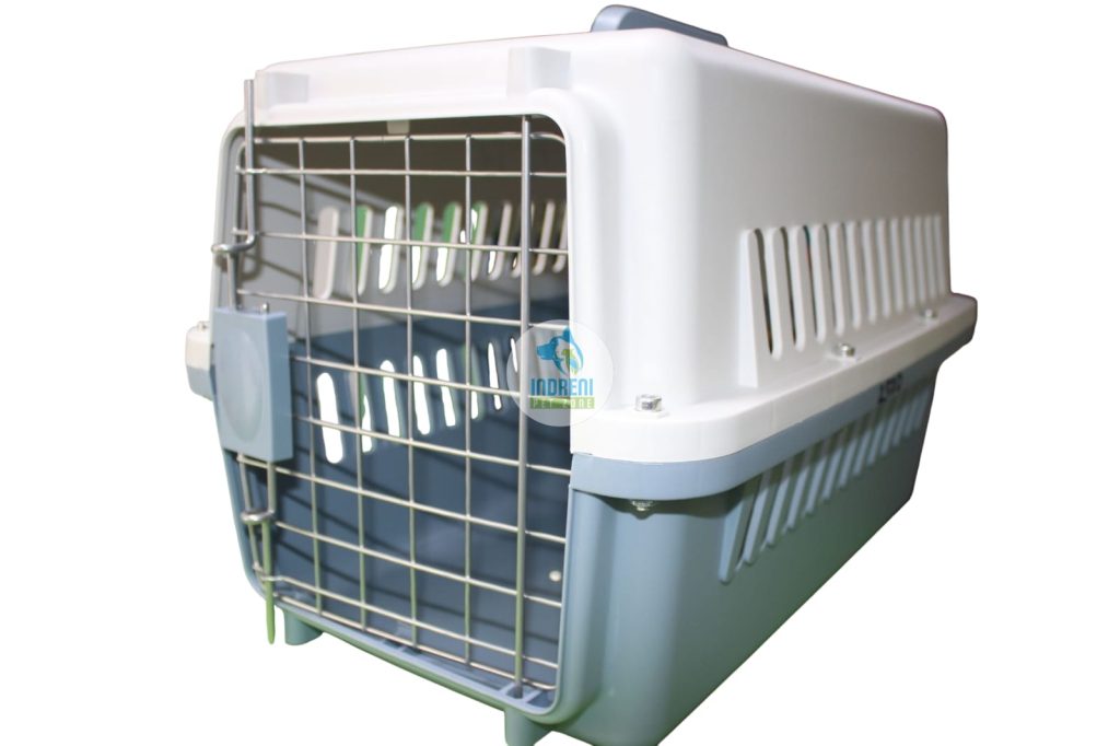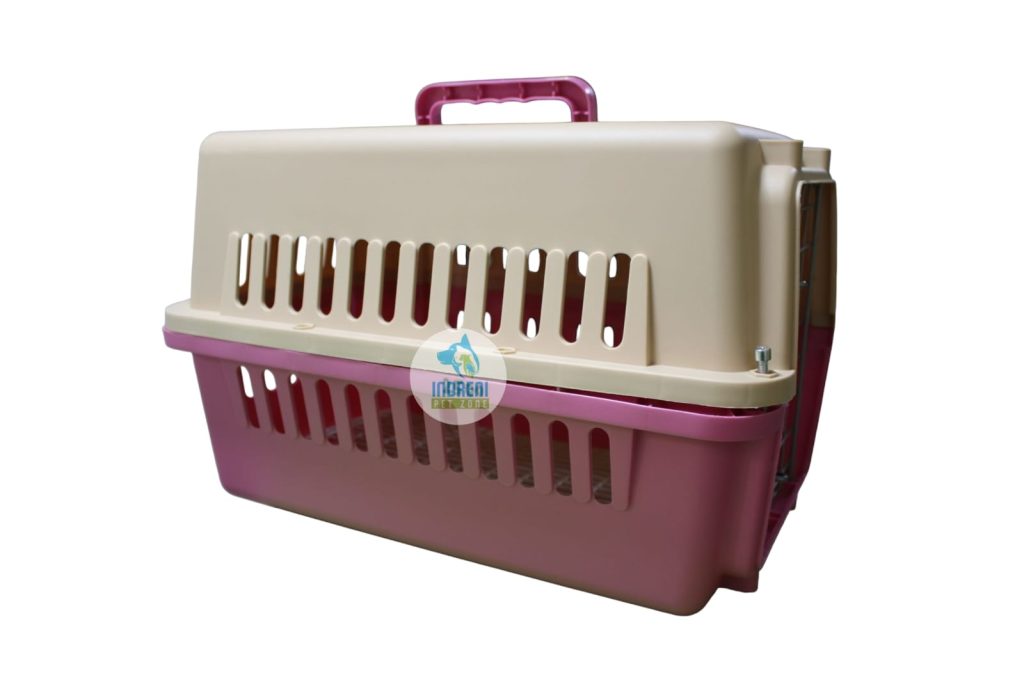 The carrier is made of durable materials and often includes a food/water bowl and tray for convenience.
